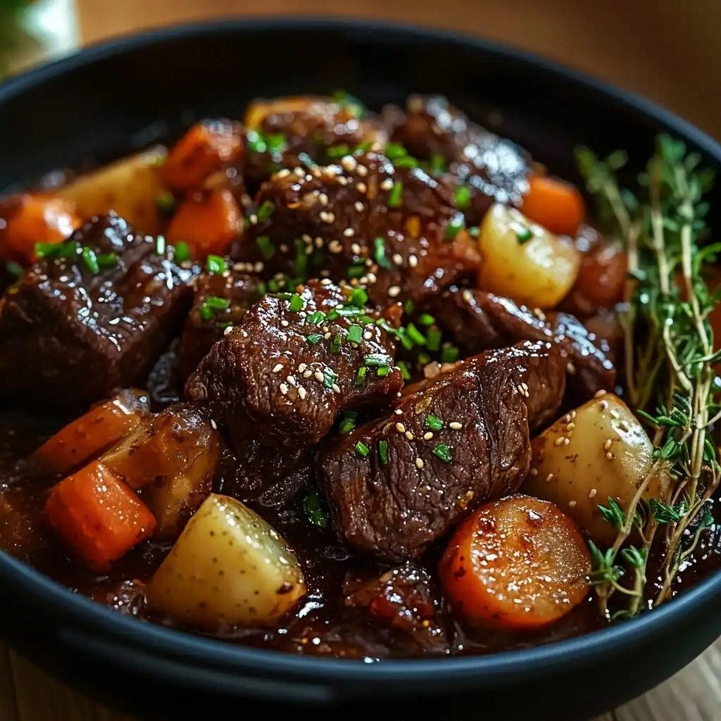 Picture this: a thick, juicy chuck roast, browned to a deep mahogany on all sides, bathed in a sauce that glistens like liquid gold. The mixture of gochujang, honey, and Korean pear creates a sweet‑spicy glaze that coats the meat like velvet, while the carrots and potatoes add a comforting, earthy counterpoint. Every bite delivers a symphony of flavors—umami, heat, sweetness, and a subtle tang from the vinegar—making each mouthful a revelation. The texture is a paradox: the exterior is caramelized and slightly crisp, while the interior melts in your mouth, releasing a cascade of juices that cling to your palate.
